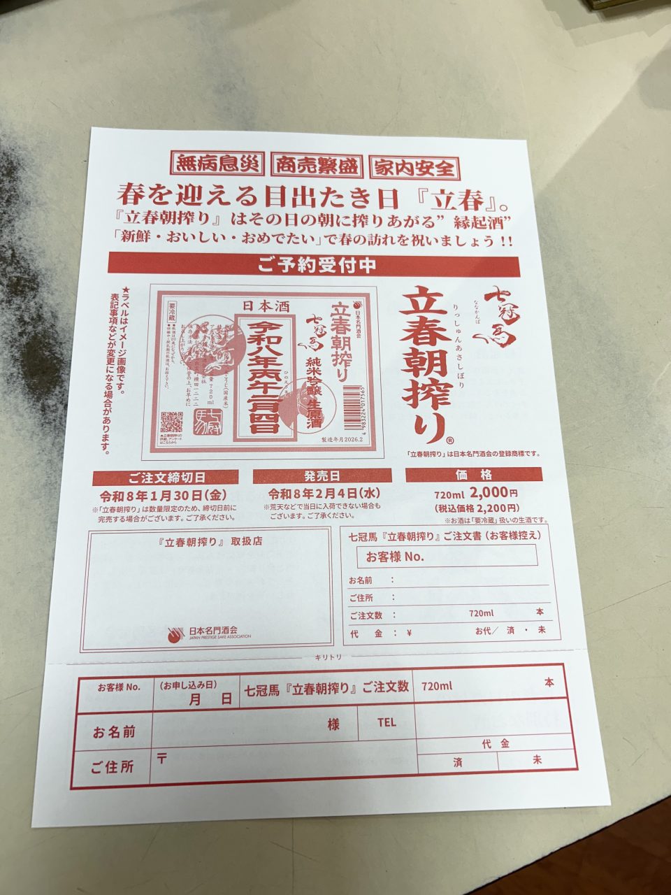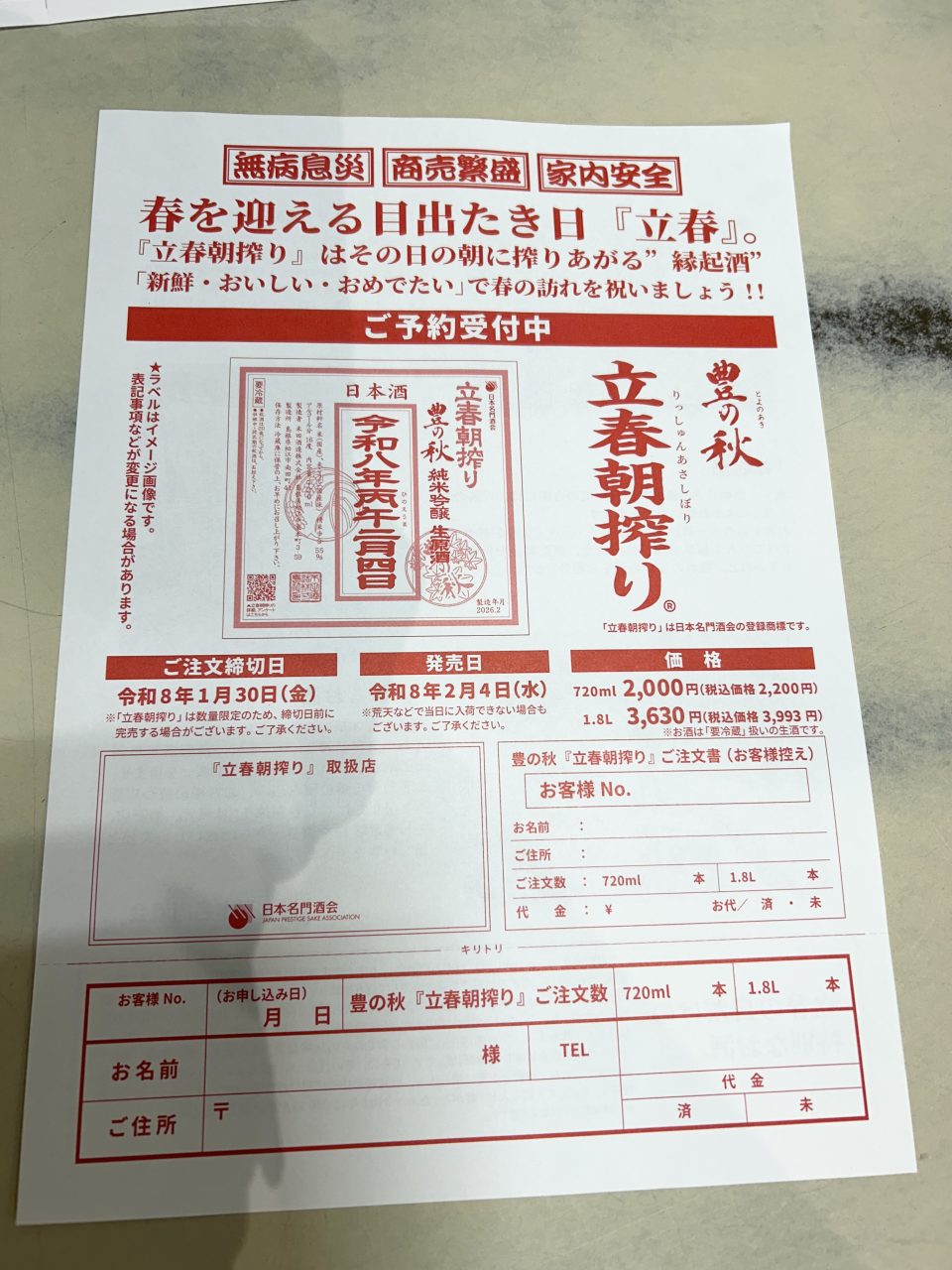 いよいよ来週発売の『立春朝搾り』。まだまだご予約受付中です(ご予約無しでもご購入いただけます)。豊の秋と七冠馬。発売は4日ですが当店定休日のため5日からお渡しとなります。立春の朝に搾った縁起のいいお酒。ぜひどうぞ!